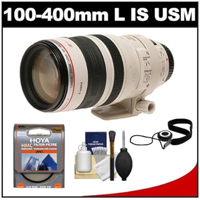 Kit includes: ♦ 1) Canon EF 100-400mm f/4.5-5.6 L IS USM Telephoto Zoom Lens ♦ 2) CapKeeper 2 Lens Cap Strap ♦ 3) Hoya 77mm HMC UV Digital Multi-Coated Filter ♦ 4) Precision Design Deluxe 6-Piece Lens & Digital SLR Camera Cleaning Kit The Canon EF 100-400mm f/4.5- 5.6L IS USM lens offers high resolution, superb contrast, neutral color balance, and Canon's built-in Image Stabilizer function. Auto-focusing is fast and silent with Canon's Ultra-Sonic Motor, and AF speed is further enhanced through an advanced, lightweight rear focusing design. This lens is also equipped with a dual-mode Image Stabilizer suitable for panning as well as stationary subjects. With full-time manual focus, one-touch zooming with a wide grip, and a special ring that permits adjustment of zooming friction, this is a lens that's extremely easy to use, and ideal for a wide variety of applications including nature, wildlife, sports, and documentary photography. Keep your lens cap securely attached to your lens with the convenient, simple-to-use CapKeeper. Never lose a lens cap again! The Hoya HMC Ultraviolet UV Glass Filter is a multi-purpose, fine-weather filter that is designed to optimize the photography experience of the digital SLR user. UV filters, absorb ultraviolet rays that often make outdoor photographs hazy and indistinct, and should be constantly fitted to a lens to provide improved clarity and color balance, as well as to provide protection to your lens. This 6-piece cleaning kit contains everything you'll ever need to properly clean your lenses, including a Hurricane Air Blower, Lens Cleaning Tissues, Lens Cloth, Lens Cleaning Liquid, Brush and Cotton Swabs.
