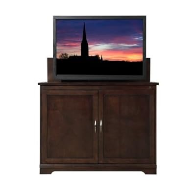 71070 Features: -RF Wireless Remote Control: Radio Frequency wireless remote control, for single remote operation of the cabinet lift. When the remote is not handy, each unit has an auxiliary on/off switch and set control switch inside the cabinet.-Power strip for 4 additional components.-Solid Wood Tongue and Groove Corner Blocks: Incorporates the side panels of the cabinet with the foot of the cabinet adding structural support.-Easy Access Cabinet Back Design: Each cabinet features sliding rear access panels, for simple path to the lift, components and electronics.-Cabinet Lids are Triple Hinged: The hinges are screwed into three surfaces proving greater structural support of the moving parts. Includes: -Personal Storage Space: Includes 4 shelves and shelf clips, making it fully adjustable to store DVDs/CDs discs or games. Options: -Optional side cabinets available for additional media storage. Construction: -English Dovetail Joints: These joints strengthen the cabinets so separation becomes nearly impossible. Dovetail joints becomes self-locking even before the glue is applied at the factory, so solid overall construction can be guaranteed.-Solid Wood Construction: The finest woods are carefully selected for all cabinet sides, tops and panels, matched for grain and color. Solid wood makes these cabinets as durable as they are beautiful. Color/Finish: -Espresso finish. Specifications: -Lift System: Patent-pending and proprietary, Touchstone's lift system is ultra smooth and quiet. There are only 2 moving parts and the electronics are separate from the lift itself. You can set the lift at up or down stopping points to exactly fit your TV Lifts. Each lift has been tested for over 30,000 cycles with a 200 lb. weight, and carry the UL approval.-Component Storage Space: There is 8 of vertical storage height and cabinet width horizontal space for components, cable boxes and disc players. Dimensions: -Overall dimensions: 38'' H x 50'' W x 20.5'' D.-Maximum TV size: 31''