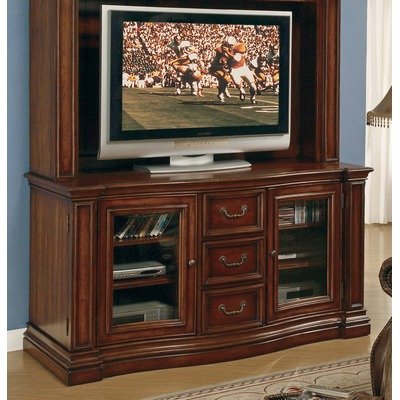 429-55-480 Finish: Black Pictured with Hutch (Hutch not Included) Features: -Hardwood Solids and Cherry Veneers.-Two wood-framed glass side doors open to reveal two adjustable shelves behind each.-Three drawers with dividers for CD/DVD storage.-Levelers.-Will accommodate up to a 50in. television. Be sure to measure your television before purchasing. Options: -Available in lightly distressed medium cherry finish with burnishing or black finish with cranberry red rub-through and gold burnishing. Color/Finish: -Finished top. Dimensions: -Overall dimensions: 32.75'' H x 61.75'' W x 25.25'' D.