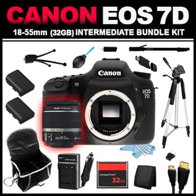 ***Included in your Canon EOS 7D 18 MP CMOS Digital SLR Camera with 3-Inch LCD and Canon EF-S 18-55mm f/3.5-5.6 IS SLR Lens (32GB Intermediate Bundle Kit)***Canon EOS 7D 18 MP CMOS Digital SLR Camera with 3-Inch LCD and Canon EF-S 18-55mm f/3.5-5.6 IS SLR Lens32GB (CF) CompactFlash Memory CardHigh quality and reliability.Memory Card WalletSafe storage for your memory cards.(All In One) SD/SDHC Card USB Reader/WriterHigh Speed. Easy plug and play. Use with SD/SDHC/microSD/MS Pro Duo/M2.x2 BatteriesLithium-Ion battery for your camera.Home/Car AC/DC ChargerCharge your battery at home and on the road. Smart LED indicator shows charging status.Camera Carrying CaseMedium carrying case. Includes shoulder strap.6' HDMI to HDMI Mini CableHigh-Definition signal up to 1080p57" Tripod Full Size Photo/Video TripodExtends to 57-Inch. 3 way pan head.6" Mini Tabletop TripodCompact size, three flexible wire legs.67" Aluminum MonopadUltra-light weight aluminum alloy construction. Ideal for indoor/outdoor.Dust BlowerPerfect for keeping your camera clean.***Also included in your kit***Bottle of Lens Cleaning Solution with 5 Cotton SwabsScratch Safe Cleaning Cloth3 LCD Screen GuardsSqueegee Card