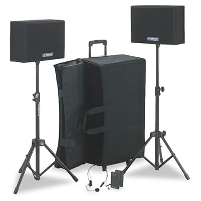 AmpliVox - Portable Wireless Powered Speaker Voice Projector Kit, Black - Sold As 1 EachComplete wireless sound system with separate wireless powered speakers that can be placed up to 300 ft. apart with no cables to connect. Each cabinet has two built-in Jensen design speakers (4 total), a built-in receiver, 50W stereo amplifier with three mic inputs, auxiliary jack with separate volume control for CD players or computer projectors and a line out jack for recording presentations. Use inside or outside to reach audiences of up to 1,500 in rooms up to 15,000 square feet. Completely wireless design makes setup and breakdown a snap. Power source: Ten D batteries (sold separately) in each cabinet. Maximum batter operation time: 200 hours. Mic Input Types: Condenser; Dynamic; Wireless; Number of Mic Inputs: 3; Speaker Type: 6" x 8" Jensen Speaker; Number of Speakers: 2.Complete wireless sound system.Use inside or outside for audiences of up to 1,500 in rooms of up to 15,000 sq. ft.Speakers can be placed up to 300 ft. apart.Easy setup and break down.Includes two speaker cabinets with built-in amplifier and receiver, wireless lapel mic, wireless headset mic, two transmitters, two tripods and mounts, projector and computer interface cables, wheeled carrying case with retractable handle.