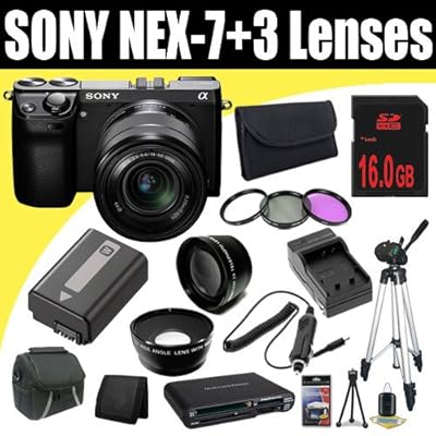 This DavisMAX Bundle Includes: 1- Sony Alpha NEX-7 24.3 MP Digital Camera with Interchangeable Lens 1- Sony E-series 18-55mm f/3.5-5.6 OSS Lens Brand New USA w/ Supplied Manufacturer Accessories 1- Rechargeable NPFW50 Lithium Ion Replacement Battery (Not Original Sony) (Don't Miss out on a Memory!) 1- External Rapid Quick, Travel Charger w/ Car Charger Attachment (Always Have an Extra Battery on Deck!) 1- 16GB SDHC Class 10 Secure Digital High Speed Memory Card 1- 49mm 0.45x Wide Angle Lens w/ Pouch and Caps (Capture That View!) 1- 49mm 2x Telephoto Lens W/ Pouch and Caps (More Zoom is better!) 1- 49mm 3 Piece Filter Kit Includes: UV, Circular Polarizer and Flourescent Filter and Hard Case 1- Padded Carrying Case (Protect your Investment!) 1- Full Size 50" Tripod W/Carry Bag (Keep it Steady!) 1- Multi 50 in 1 USB Memory Card Reader (Download Images Instantly to Your Computer!) 1- Memory Card Wallet (Keep your memories safe!) 1- Pack of LCD Screen Protectors (Protect your LCD!) 1- Lens/LCD Maintenance Cleaning Kit 1- Mini Table Top Tripod More about this camcorder:Sony's Alpha NEX-7 Digital Camera with 18-55mm Lens is an extremely high 24.3Mp resolution camera with the aforementioned lens included. You can start shooting from day one with this combo, the 18-55mm lens of course being just one of the numerous lens options you have for this Sony E-Mount compatible camera. Non-Sony lenses are compatible with the camera as well using an optional adapter. Supplied Accessories in addition to mentioned above:NP-FW50 Lithium-Ion Rechargeable Battery, BC-VW1 Battery Charger, Mini B USB Cable, Software CD, Shoulder Strap, Front Cap, 1 Year Sony USA Warranty.