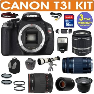 Best1 REFURBISHED CANON REBEL T3I 18MP Digital Camera Body and ALL Supplied Accessories in Manufacturer Box . CANON 18-55mm IS LENS + CANON 75-300mm ZOOM LENS + VIVITAR 500mm MIRROR LENS + 2X TELECONVERTER LENS + .40X SUPER WIDE ANGLE FISHEYE LENS + 650-1300mm Zoom Lens . 16GB High Speed Memory Card Class 10 + 2 UV Filters (52mm + 62mm) + 2 CPL Filters (52mm + 62mm) . Vivitar Backpack Case + Holster Case + Slave Flash + USB Card Reader . 3 Year Celltime Warranty Repair Package . review