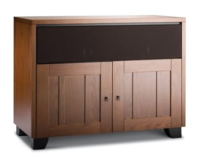 Best1 Twin-width A/V cabinet with mid-century modern design and medium walnut finish . Solid frame-and-panel doors blend comfortably with most furniture . Top opening is faced with removable grille that hides center-channel speaker . Holds 4 components in main compartment; supports 42-inch TVs (200 pounds) . Pinch-out rear panels; measures 44 by 31.75 by 21.25 inches (W x H x D) . review