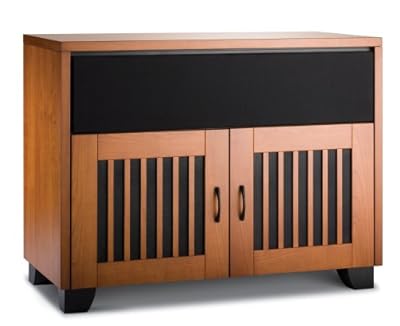 Best1 Double-width A/V cabinet inspired by ever-popular arts and crafts style . Front door panels with contrast vertical wooden strips and black steel inserts . Top opening is faced with removable grille that hides center-channel speaker . Holds 4 components in main compartment; supports 42-inch TVs (200 pounds) . Includes leveler feet; measures 44 x 31.75 x 21.25 inches (W x H x D) . review