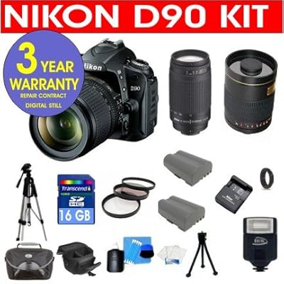 Best1 Camera Kit includes all BRAND NEW merchandise with manufacturer supplied accessories plus FULL USA warranties . Nikon D90 12.3 MP Digital SLR Camera + Rokinon 500mm F/8 Lens with 2x Converter (=1000mm) . 18-55mm f/3.5-5.6G AF-S DX VR Nikkor Zoom Lens + Nikon 70-300mm F/4-5.6 Telephoto Zoom Lens . 16 GB Memory Card + UV Filter (2) + PL Filter . Deluxe Camera Bag + 50" Tripod + 3 Year CELLTIME Warranty Repair Contract . review