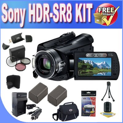 Kit Includes!1- Sony HDR-SR8 100GB Hard Drive Digital Camcorder w/All Supplied Accessories2- Extended Life Batteries (Great for Vacation!)1- Ac/Dc Rapid Charger (Great for Vacation!) 1- UV, Florescent, Polarizer Filter Kit w/Case (Protect Your Lens!)1- Deluxe Case W/strap (Protect Your Camera!)1- Pack of LCD Screen Protectors (Protect from Dust And Scratches!)1- Lens/LCD Cleaning Kit1- Mini Table Size TripodMore About This Camcorder!Capture up to 38 hours of your life's special moments in Full HD 1080p video. Use professional grade Carl Zeiss Vario-Sonnar Lens 10x optical/20x digital zoom to get the action close to you. Capture both video and still digital imagery at the same time without switching modes with the Dual Record Mode function. Eliminate blurring from unsteady hands with the Super SteadyShot(R) optical image stabilization system. Smear-free images can be yours with a 1/2.9" ClearVidT CMOS Sensor to enhance sensitivity, creating less image noise in low light, higher pixel still images and greater detail, even when recording standard definition video.