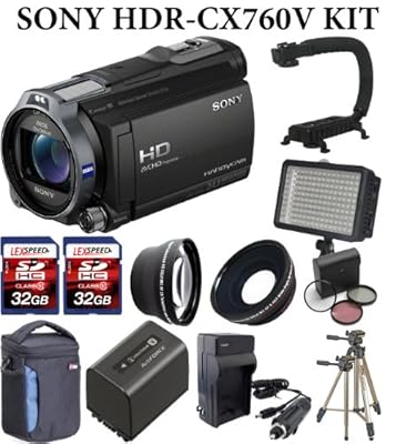 The Sony HDR-CX760V Camcorder Kit Includes:1. Sony HDR-CX760V Camcorder.2. Sony NP-FV70 Rechargeable Camcorder Spare Battery Pack.3. Deluxe Camcorder Bag.4. TWO (2X) LexSpeed 32GB SDHC Class10 Memory Card.5. 3pc Multi-Coated Essential Filter Kit.6. 110/240v Travel charger. Includes a European adapter plug and a car Charger.7. 6' HDMI Cable. 8. Sunpak SDHC USB 2.0 Card Reader.9. Sunpak 5pc Digital Camera Cleaning Kit + Mini Tripod.10. Sunpak 9002 Digital Full Size Tripod.11. LCD Screen Protectors.12. Lens Pen Cleaning System.13. Memory Card Wallet.14. Inkjet Photo Paper 10 Sheets 8.5x11 Sample Pack.15. Willoughby's Exclusive Micro Fiber Cleaning Cloth.16. PhotoAmerica 96 Compact Video Light.17. Wide angle & Telephoto Lens Set.18. Action Stabilizing ForeGrip Handle.Bonus - Sunpak Solar Flashlight & Charger!Manufacturer Supplied Accessories: NP-FV50 Rechargeable Battery Pack AC Adapter (AC-L200) Power Cord AV Connecting Cable HDMI Cable (Full to Mini) USB Connection Support Cable Handycam Application Software CD-ROM 1-Year Limited Parts & 90-Day Labor Warranty